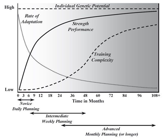 The graph above (from Starting Strength by Mark Rippetoe) outlines these general principles. As you can see, there is a ceiling for what you are capable of long-term, your “individual genetic potential.” Honestly, this is a helpful concept, but of limited utility because it cannot be pinned down, only guessed at for a given exercise as you progress further and further along in performance and years. It will of course go down over time as you age up significantly (every 5 years or so).